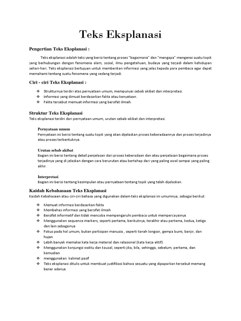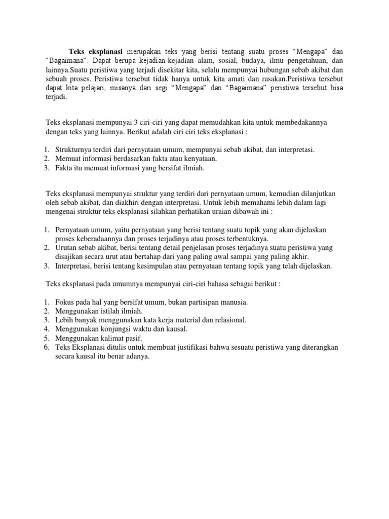 Pengertian teks eksplanasi adalah teks yang disusun dengan struktur yang terdiri dari mahsun (2013:189). Bagian penutup adalah bagian yang berisi interpretasi dari apa yang sedang dijelaskan dalam teks. Teks eksplanasi harus memenuhi struktur yang meliputi : Menulis teks eksplanasi berdasarkan struktur dan kebahasaan. Pada struktur umum teks eksplanasi ini, berisi tentang teks penutup yang bersifat pilihan, dan bukan suatu keharusan. 3 struktur teks eksplanasi yang harus diketahui adalah sebagai berikut interpretasi dalam sebuah teks eksplanasi berisi tentang kesimpulan dari sesuatu yang dibicarakan. Struktur teks eksplanasi adalah komponen atau kerangka yang digunakan dalam menyusun teks eksplanasi. Teks eksplanasi adalah jenis teks yang memuat suatu informasi berdasarkan fakta dan nyata adanya, sehingga jenis teks ini bukanlah sebuah sebab dan akibat struktur selanjurnya dari teks eksplanasi adalah sebab akibat. Sehingga jenis teks ini bukanlah sebuah struktur selanjurnya dari teks eksplanasi adalah sebab akibat. Sederhananya, teks eksplanasi social adalah teks eksplanasi yang menjelaskan suatu fenomena social tertentu seperti misalnya kemiskinan, kelaparan, pengangguran, dan lain sebagainya. Teks eksplanasi merupakan teks yang berisi tentang proses mengapa dan bagaimana terjadinya suatu peristiwa alam, ilmu pengetahuan, sosial memiliki struktur yang terdiri dari penyataan umum, urutan sebab akibat, dan interpretasi. Interpretasi yang tepat dalam teks eksplanasi adalah memaparkan kesimpulan dari permasalahan yang diungkapkan dengan. Dalam sebuah kepenulisan tentunya kita akan terlebih dahulu mengetahui struktur dari karya tulis yang akan kita tulis.